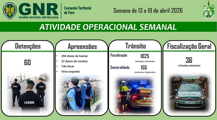O Comando Territorial de Faro da Guarda Nacional Republicana levou a efeito um conjunto de operações no distrito de Faro, na semana de 13 a 19 de abril, que visaram a prevenção e o combate à criminalidade violenta, a fiscalização rodoviária e a promoção da segurança pública, tendo registado os seguintes dados operacionais: