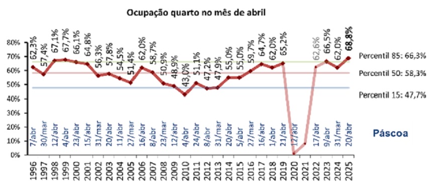 A taxa de ocupação quarto foi de 68,8%, acima do valor verificado em 2024 (+6,8 pontos percentuais, +10,9%).