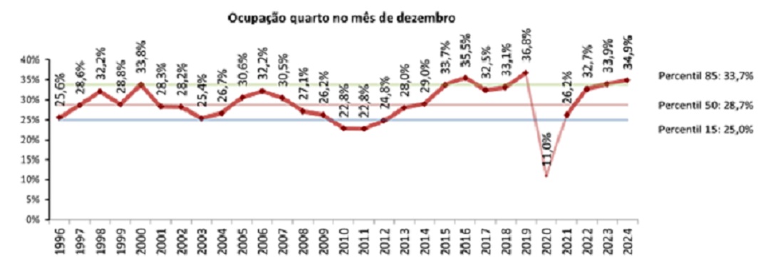 A taxa de ocupação quarto foi de 34,9%, acima do valor verificado em 2023 (+1,0 pp, +3,0%)