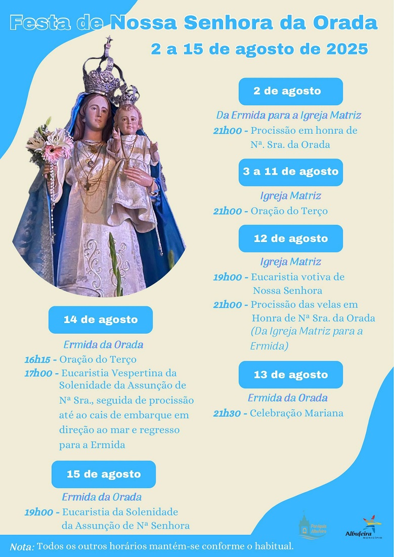 O programa de Festividades tem início no dia 2 de agosto, pelas 21h00, com a saída da Procissão em honra de Nossa Senhora da Orada, da Ermida para a Igreja Matriz. De 3 a 11 de agosto decorre a Oração do Terço, na Igreja Matriz, todos os dias, às 21h00. No dia 12, na Igreja Matriz, realiza-se a Eucaristia Votiva de Nossa Senhora, às 19h00, seguida da Procissão das Velas em Sua honra, a qual sai da Igreja Matriz para a Ermida, a partir das 21h00. O dia seguinte, 13 de agosto, é dedicado à Celebração Mariana, que acontece na Ermida da Orada, pelas 21h30.