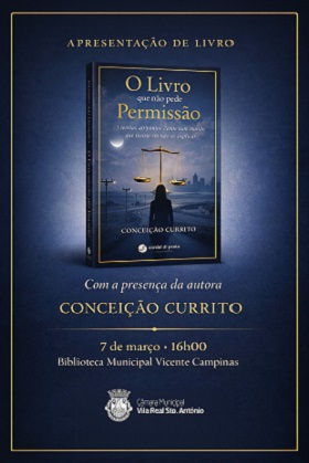 A autora Conceição Currito vai apresentar a sua nova obra, intitulada “O Livro Que Não Pede Permissão — 3 teorias, 40 pontos Zénite num mundo que insiste em não se explicar”, no dia 7 de março, às 16h00, na Biblioteca Municipal Vicente Campinas.