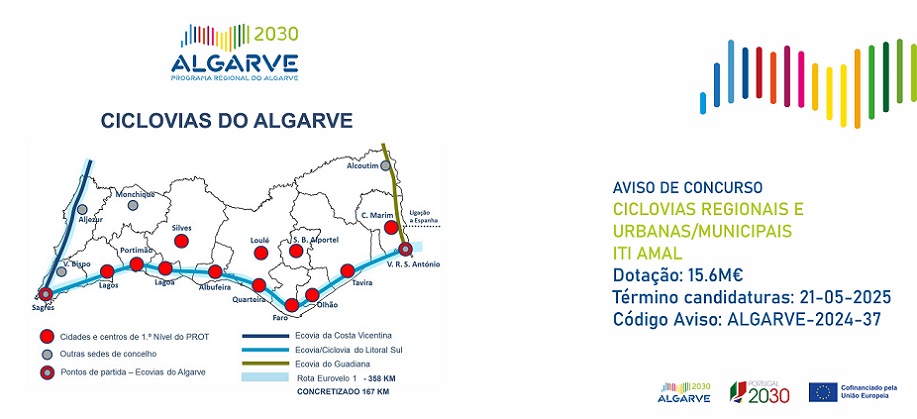 Até 21 de maio de 2025, está aberto o aviso de candidaturas para projetos de ciclovias regionais e urbanas dedicado aos Municípios. O aviso em questão (ALGARVE-2024-37) conta com uma dotação de 15.600.000€ e é dinamizado através da CIM/ AMAL.