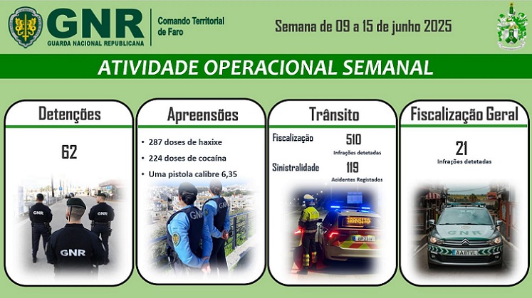 O Comando Territorial de Faro da Guarda Nacional Republicana levou a efeito um conjunto de operações no distrito de Faro, na semana de 9 a 15 de junho, que visaram a prevenção e o combate à criminalidade violenta, fiscalização rodoviária, entre outras, registando os seguintes dados operacionais: