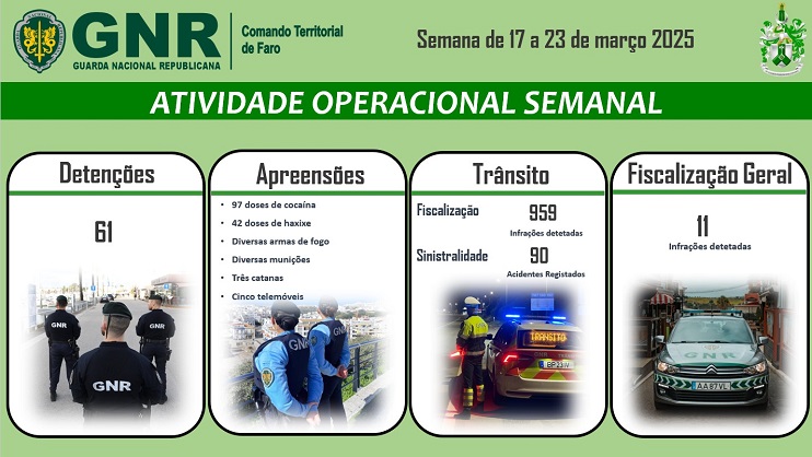 O Comando Territorial de Faro da Guarda Nacional Republicana levou a efeito um conjunto de operações no distrito de Faro, na semana de 17 a 23 de março, que visaram a prevenção e o combate à criminalidade violenta, fiscalização rodoviária, entre outras, registando os seguintes dados operacionais: