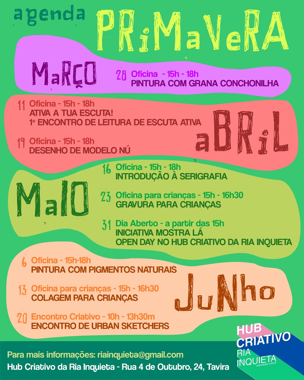 A Ria Inquieta apresenta uma nova programação de primavera no seu Hub Criativo, em Tavira, com um conjunto de oficinas e encontros a decorrer entre março e junho de 2026.