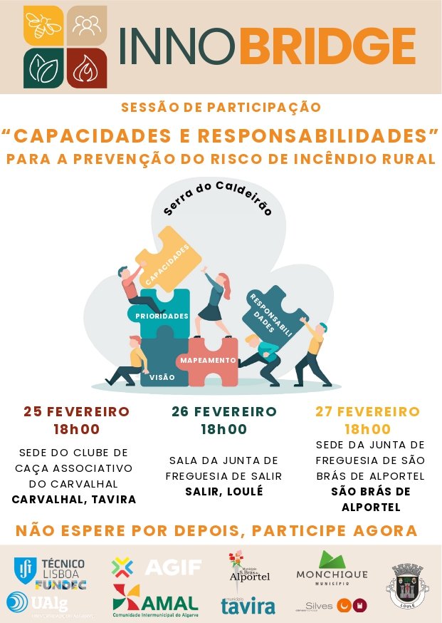 Esta iniciativa é gratuita, aberta a toda a comunidade e conta com o apoio da AGIF, da AMAL, das Câmaras Municipais de São Brás de Alportel, Tavira, Loulé, Monchique e Silves e das respetivas Juntas de Freguesia. Terá a duração aproximada de 2h00 e tem como objetivo definir as ações prioritárias a implementar no território da Serra do Caldeirão, identificando as capacidades locais existentes e necessárias e atribuindo funções e responsabilidades de cada ator envolvido e a envolver.