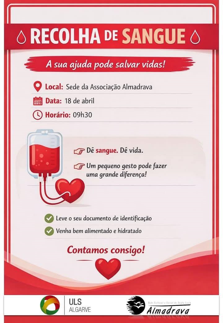 A ação terá lugar neste sábado, dia 18 de abril, na sede da Associação Almadrava, com início marcado para as 9h30. A organização sublinha a importância deste gesto solidário, lembrando que uma única dádiva pode fazer a diferença para vários doentes que necessitam de transfusões.