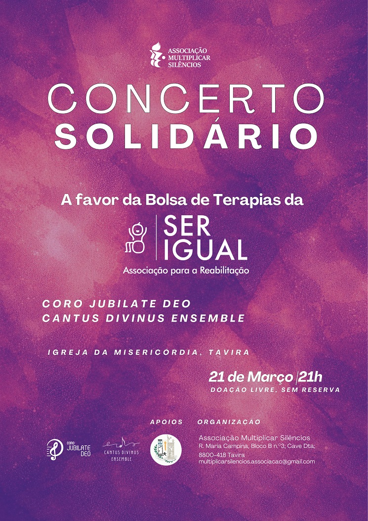 No próximo dia 21 de março, às 21h, a Igreja da Misericórdia de Tavira recebe um Concerto Solidário promovido pela Associação Multiplicar Silêncios, cujo valor angariado reverterá para a Bolsa de Terapias da SER IGUAL – Associação para a Reabilitação.