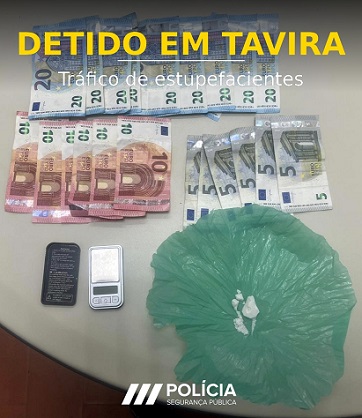 A PSP de Faro deteve um homem de 31 anos, em Tavira, por suspeita da prática do crime de tráfico de estupefacientes, tendo sido apreendidas 14,5 doses de cocaína, 290 euros em numerário e uma balança digital de precisão.