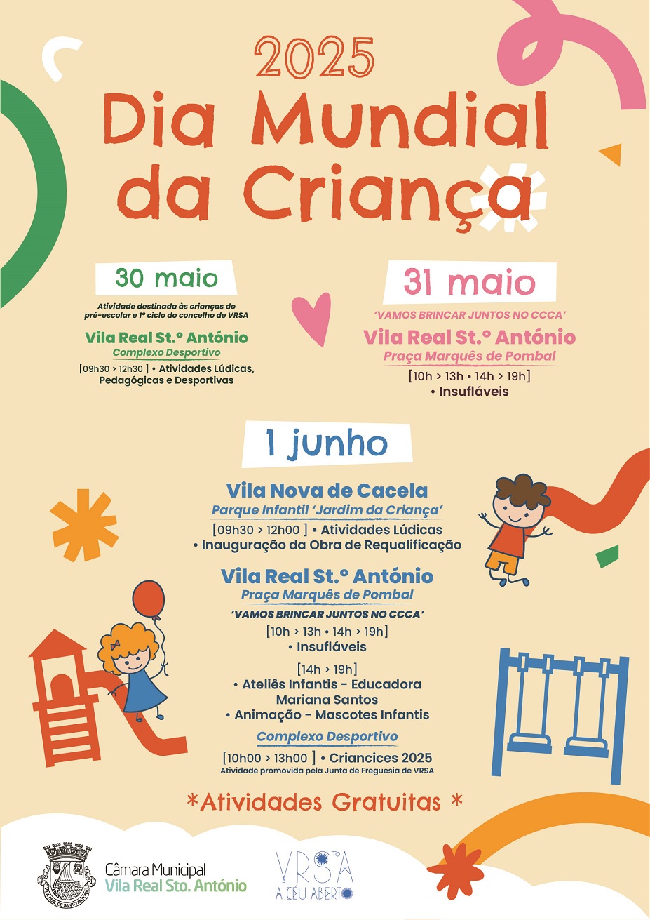 O Município de Vila Real de Santo António celebra o Dia Mundial da Criança, no domingo, 1 de junho, com um conjunto de atividades gratuitas em todas as freguesias do concelho, destacando-se a inauguração da obra de requalificação do Parque Infantil “Jardim da Criança”, em Vila Nova de Cacela.