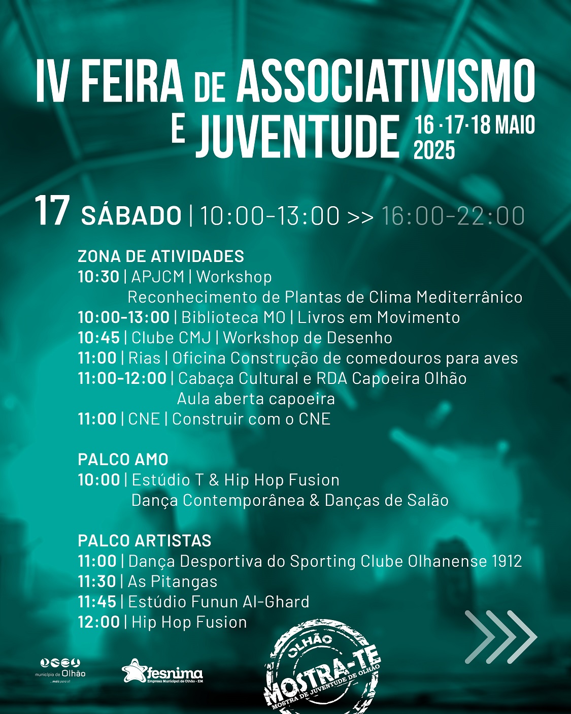 Olhão recebe, de 16 a 18 de maio, a IV Feira de Associativismo e Juventude, uma iniciativa do Município de Olhão e da empresa municipal Fesnima que celebra o movimento associativo local e promove a participação dos jovens na vi