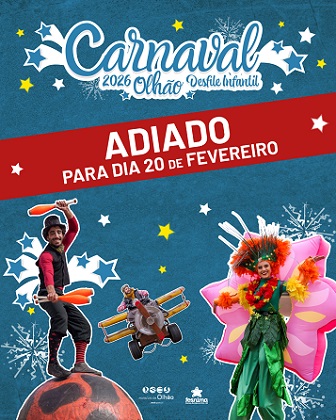 O Município de Olhão informa que, devido à previsão de condições meteorológicas adversas, nomeadamente vento forte, para a manhã de 13 de fevereiro, foi decidido adiar o Desfile de Carnaval Infantil para o próximo dia 20 de fev