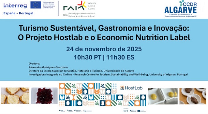 No próximo dia 24 de novembro de 2025, pelas 10h30 (PT) | 11h30 (ES), realiza-se a sessão Turismo Sustentável, Gastronomia e Inovação: O Projeto Hostlab e o Economic Nutrition Label, uma iniciativa promovida pela CCDR Algarve n