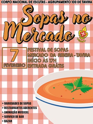 O Agrupamento 100 de Tavira do Corpo Nacional de Escutas vai realizar a terceira edição do Sopas no Mercado 2026, no dia 7 de fevereiro de 2026 no Mercado da Ribeira, em Tavira.