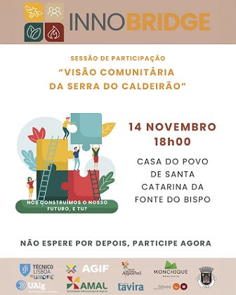 No âmbito do projeto InnoBRIDGE é lançado o convite a toda a comunidade a participar na sessão marcada para o dia 14 de novembro, das 18h00 às 20h00, na Casa do Povo de Santa Catarina da Fonte do Bispo, concelho de Tavira.