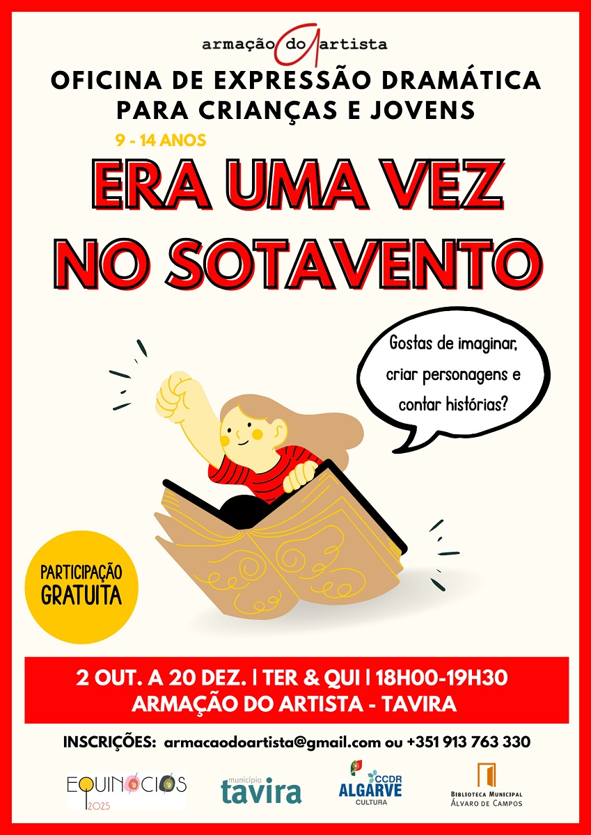 A Associação Armação do Artista dará início, no próximo dia 2 de outubro, à Oficina de Expressão Dramática “Era uma Vez no Sotavento”, integrada no Programa Municipal Equinócios 2025.