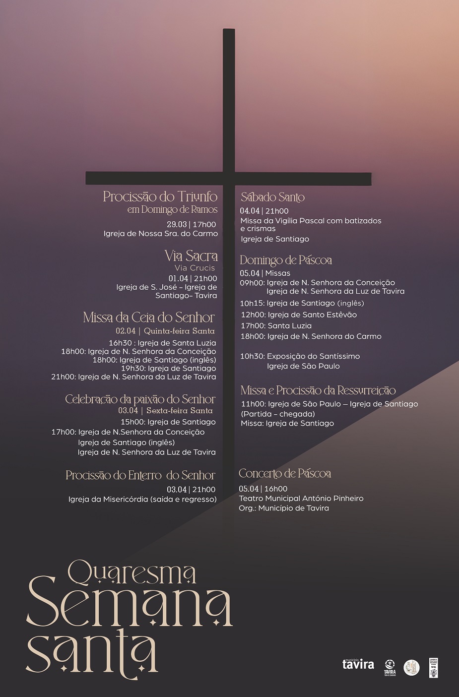 As celebrações da Semana Santa, em Tavira, integram diversos momentos, dos quais se destacam as procissões do Triunfo em Domingo de Ramos (29.03), do Enterro do Senhor (03.04), assim como o Concerto de Páscoa (05.04).
